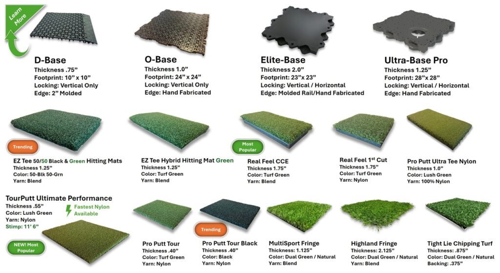 We use one of four Interlocking Panel Systems; we’ll help you decide which panel system is right for you based on functionality, features (like putting, chipping, or undulation needs), the mat style you prefer, the launch monitor you’re using, and, of course, budget. Click here to learn all about each base panel system and the sim turfs available to complement each panel.
