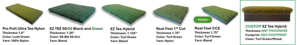 The height allows you to insert almost any premium hitting mat, Custom EZ Tee Hybrid, Real Feel CCE, or 50/50 Black / Green EZ Tee Hybrid. Any mat not equaling 2.50″ can simply be backed or shimmed to the exact height of the putting surface.
